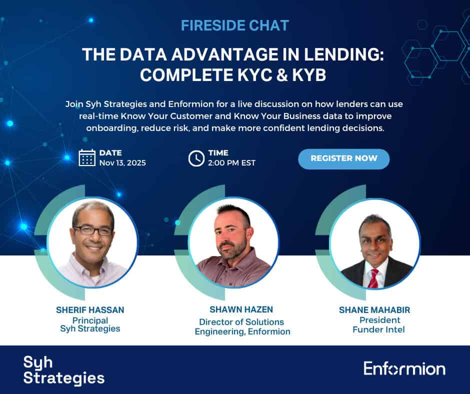 Join Syh Strategies and Enformion for a live discussion on how lenders can use real-time Know Your Customer and Know Your Business data to improve onboarding, reduce risk, and make more confident lending decisions.
